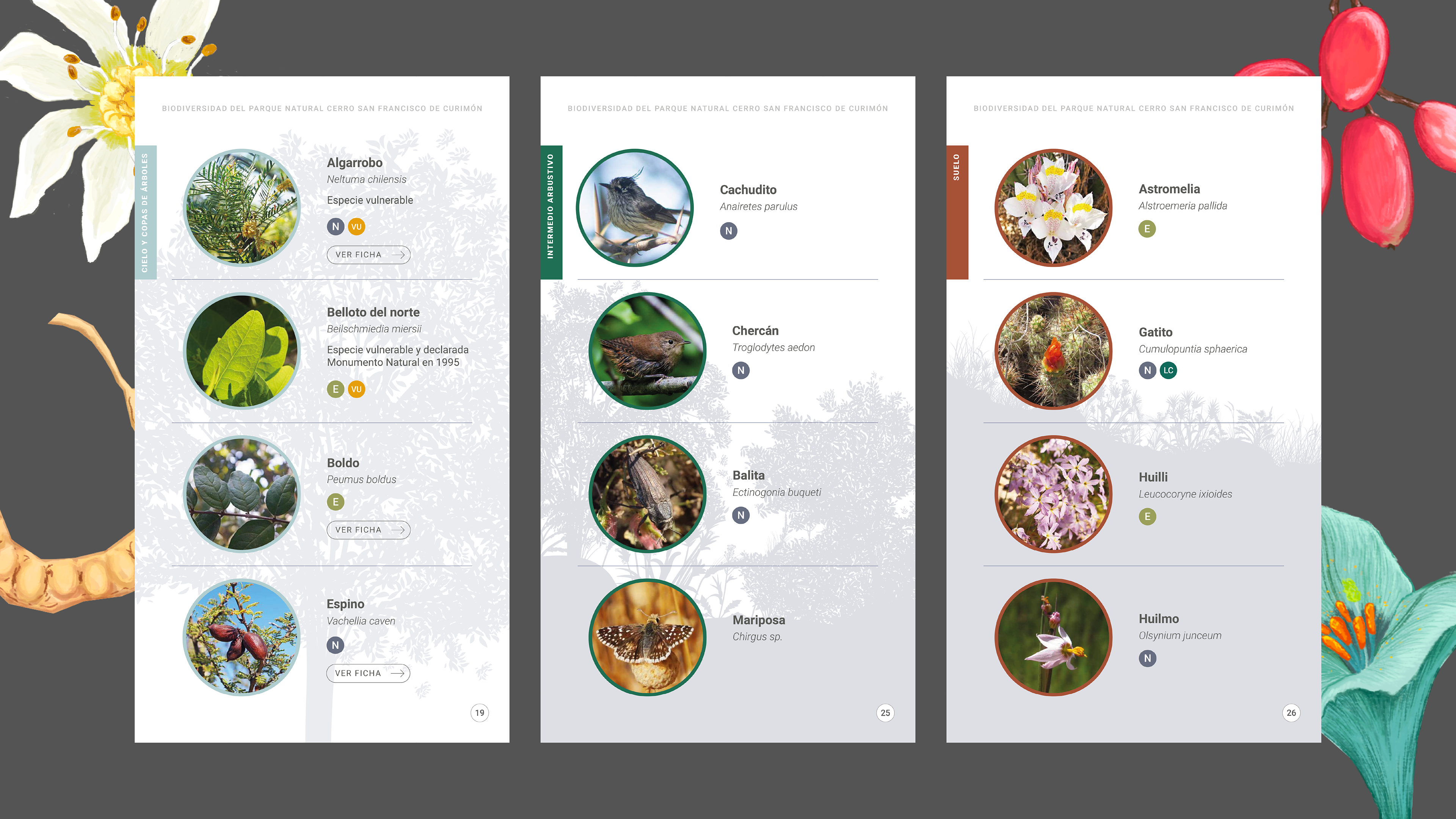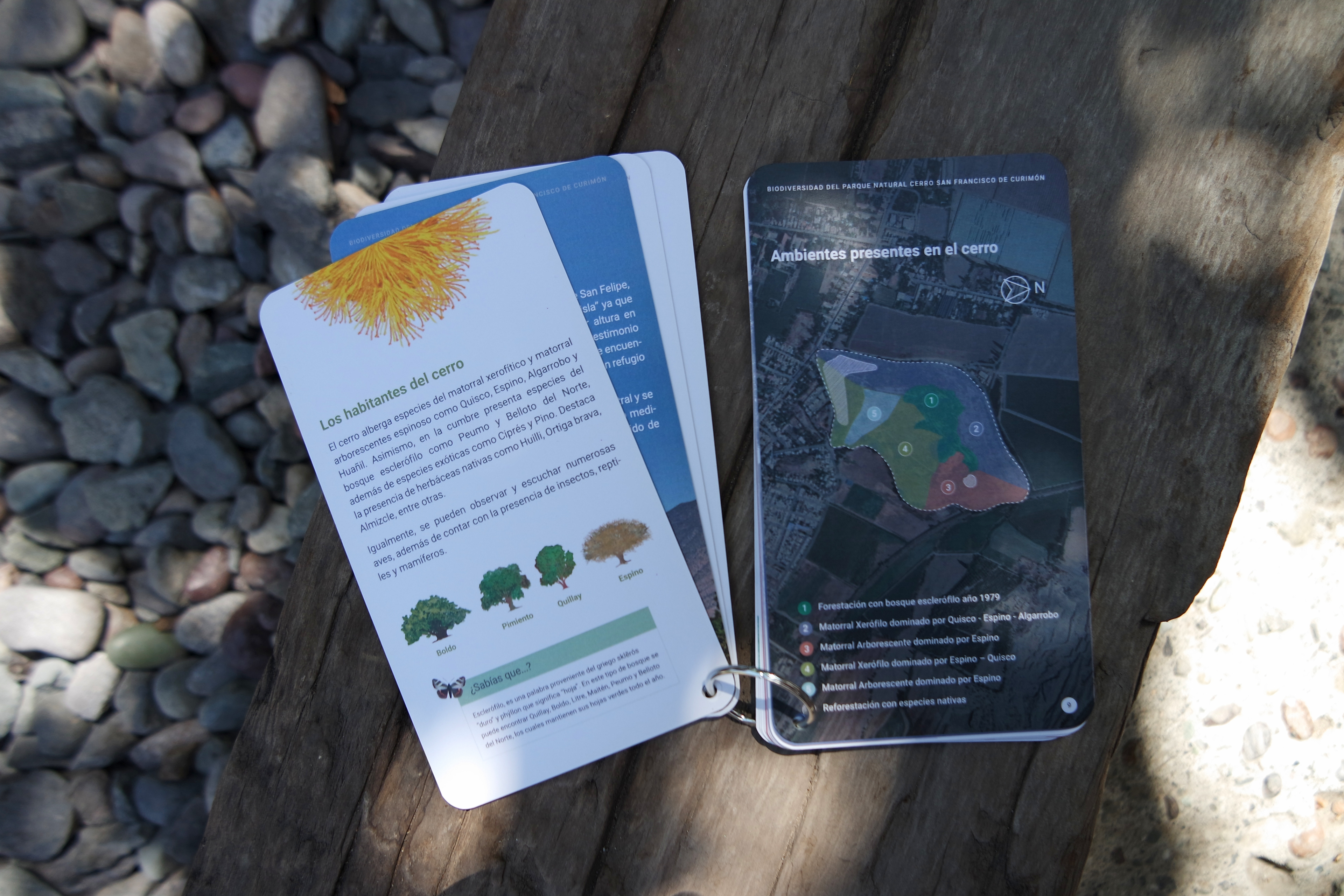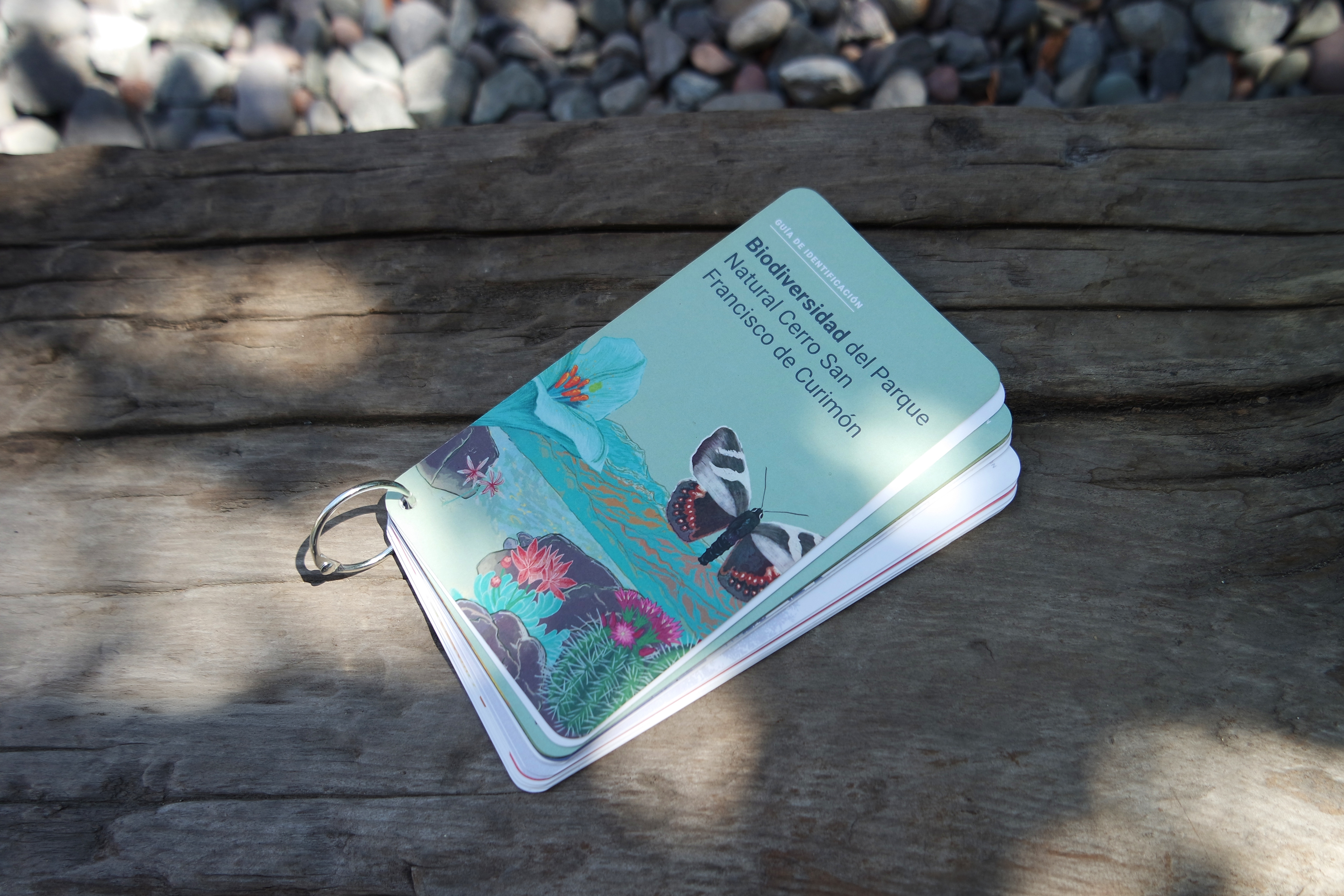Diseño de guía educativa sobre la biodiversidad del Parque Natural Cerro San Francisco de Curimón, ubicado en San Felipe. Su diseño está pensado para ser utilizado en terreno a modo de "pantonera", para así acompañar y enriquecer la visita al cerro. La guía invita a descubrir la flora, fauna y funga de este cerro isla del Valle de Aconcagua, presentando unas 100 especies nativas, endémicas y exóticas, donde se muestra información sobre su función ecológica, estado de conservación, hábitat y comportamiento, entre otros.