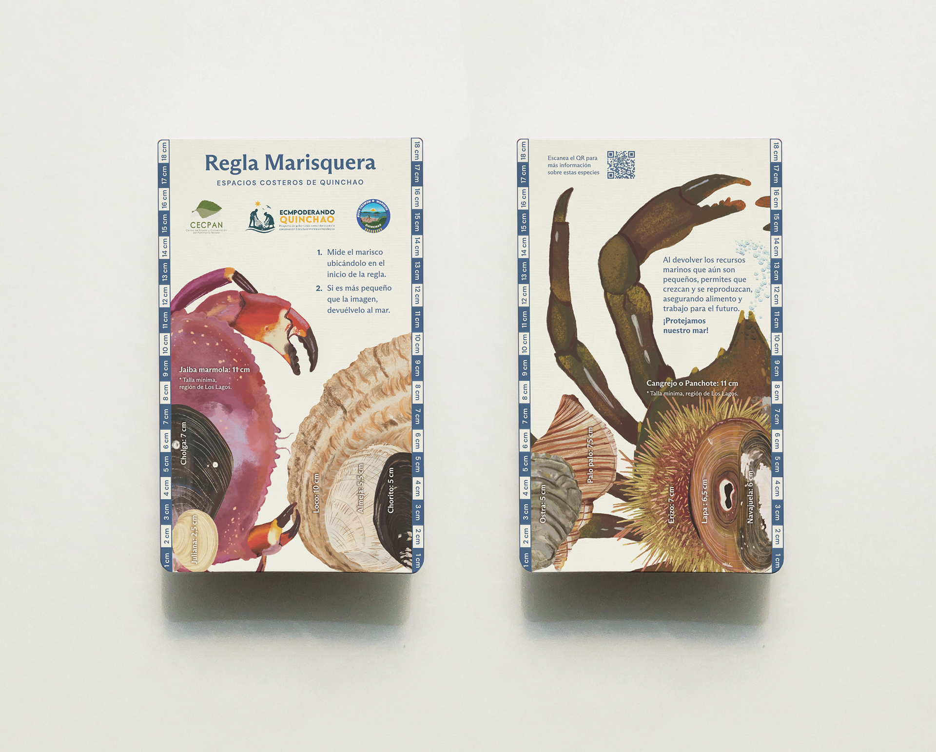 Diseño de regla marisquera, material educativo para el Centro de Estudio y Conservación del Patrimonio Natural (CECPAN), desarrollado en el Archipiélago de Quinchao, Chiloé. Esta regla es una herramienta pedagógica que enseña las tallas mínimas legales de 12 especies marinas presentes en este territorio, vinculando el conocimiento científico con la pesca y los saberes locales. Ya ha sido implementada en escuelas rurales, siendo el objetivo del proyecto fomentar la extracción responsable y empoderar a las comunidades costeras a través de la educación ambiental práctica, promoviendo la conservación de la biodiversidad marina desde la infancia.