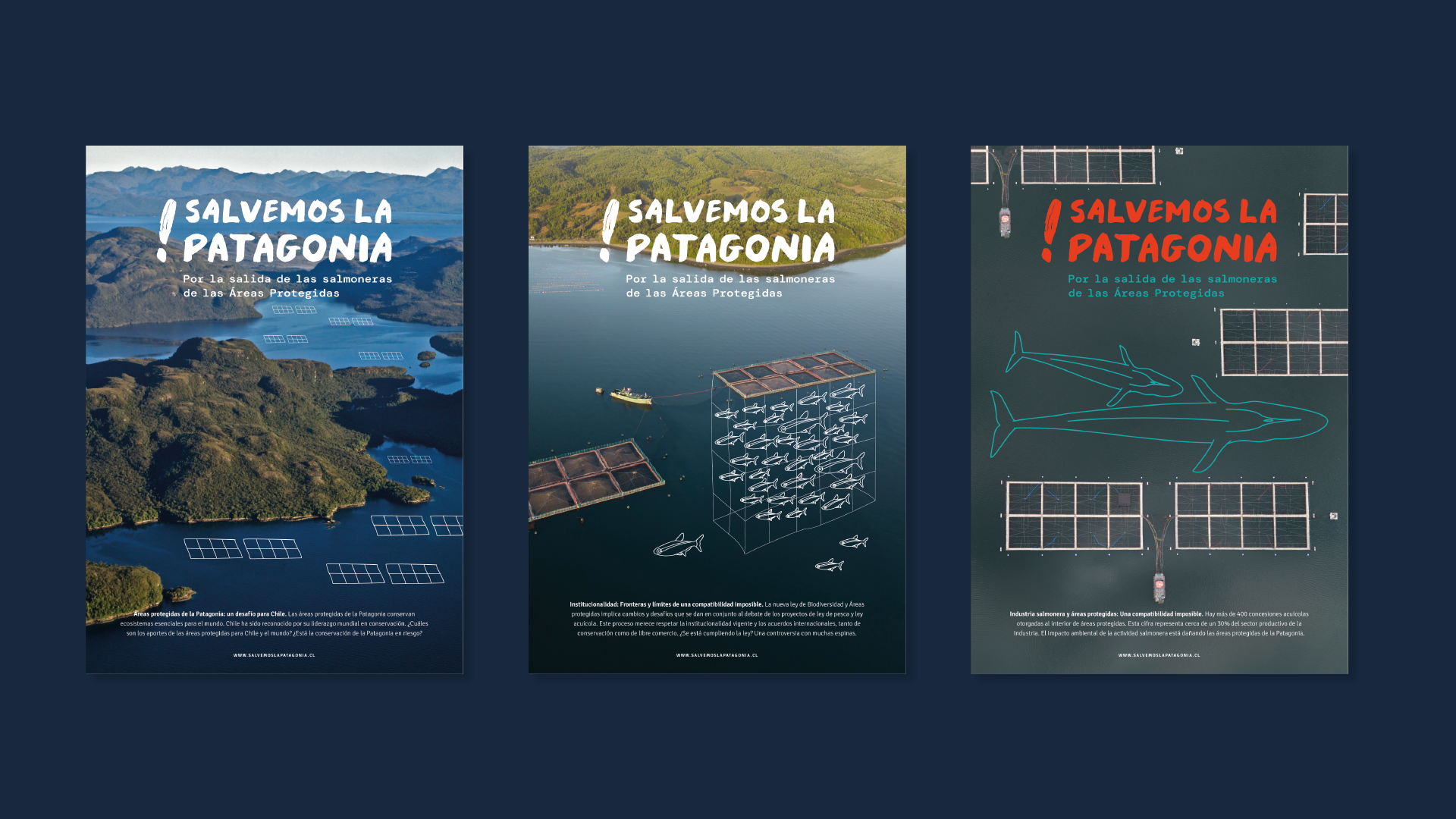 El diseño de la identidad de marca para la campaña 'Salvemos la Patagonia', promovida por la Alianza por la Defensa de las Áreas Protegidas, tiene como objetivo comunicar con fuerza la urgencia de eliminar las concesiones salmoneras dentro de parques nacionales y reservas, sin considerar su reubicación. Esta iniciativa busca proteger el valioso ecosistema de la Patagonia chilena de los impactos de la industria salmonera.