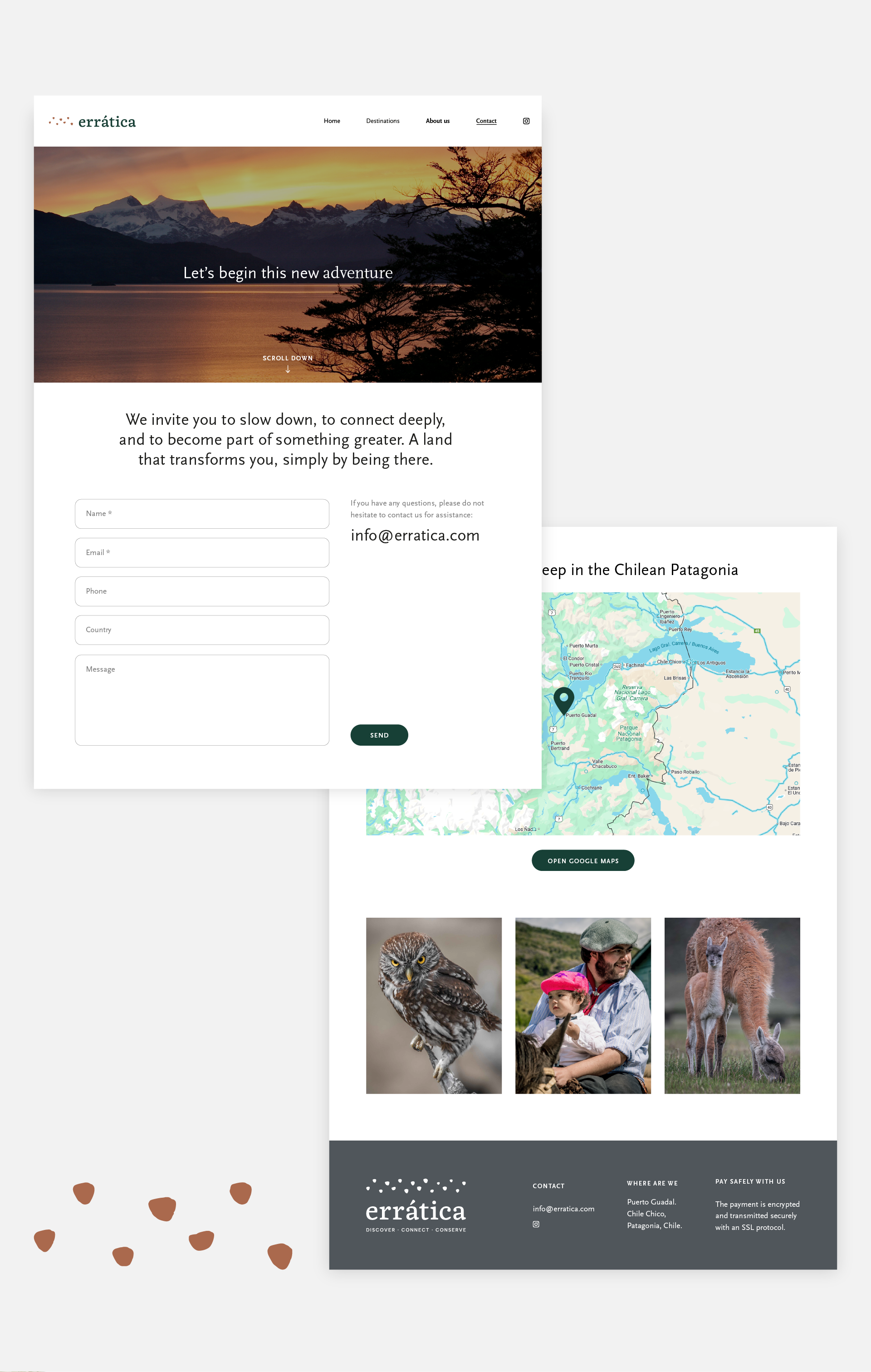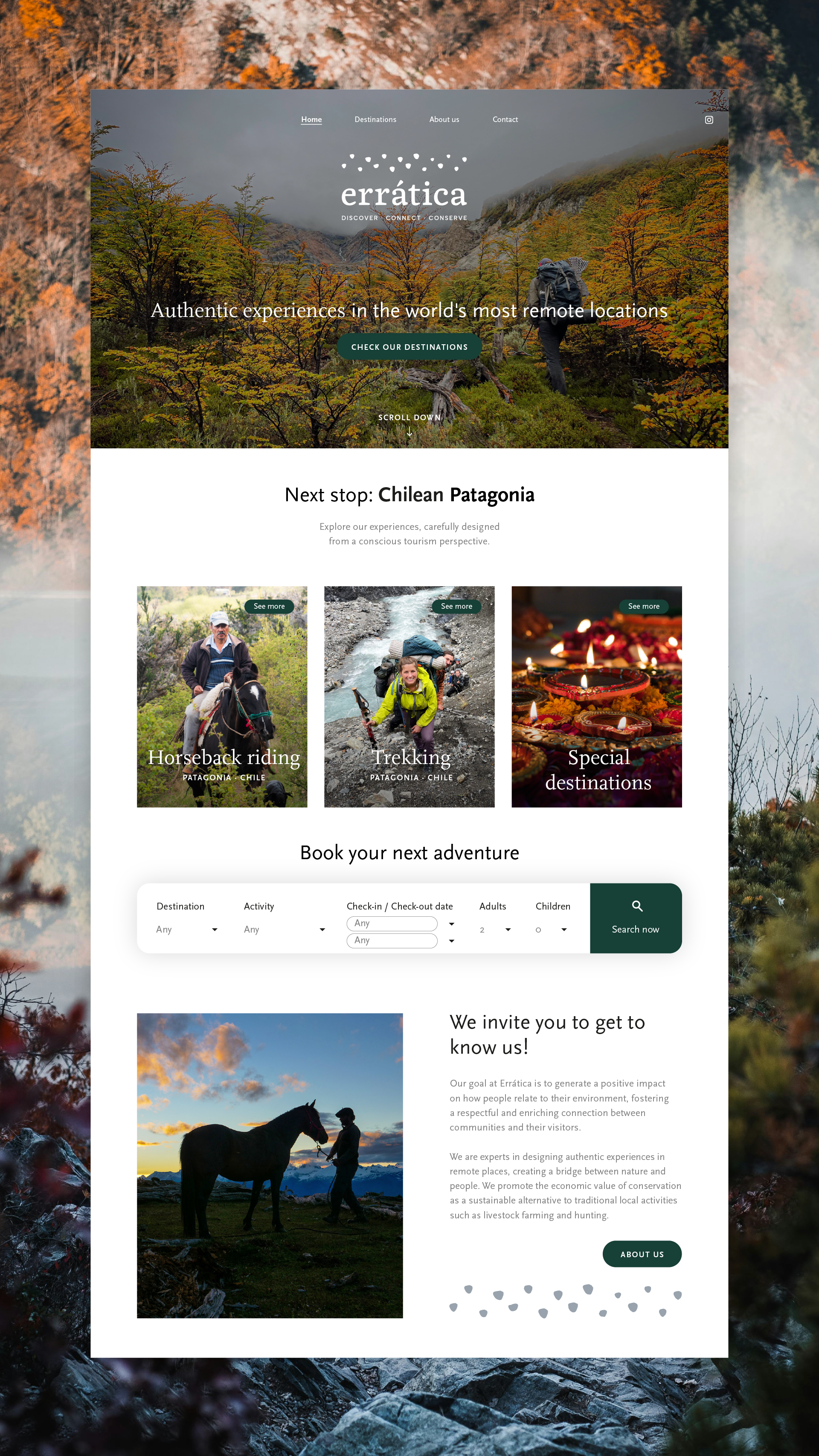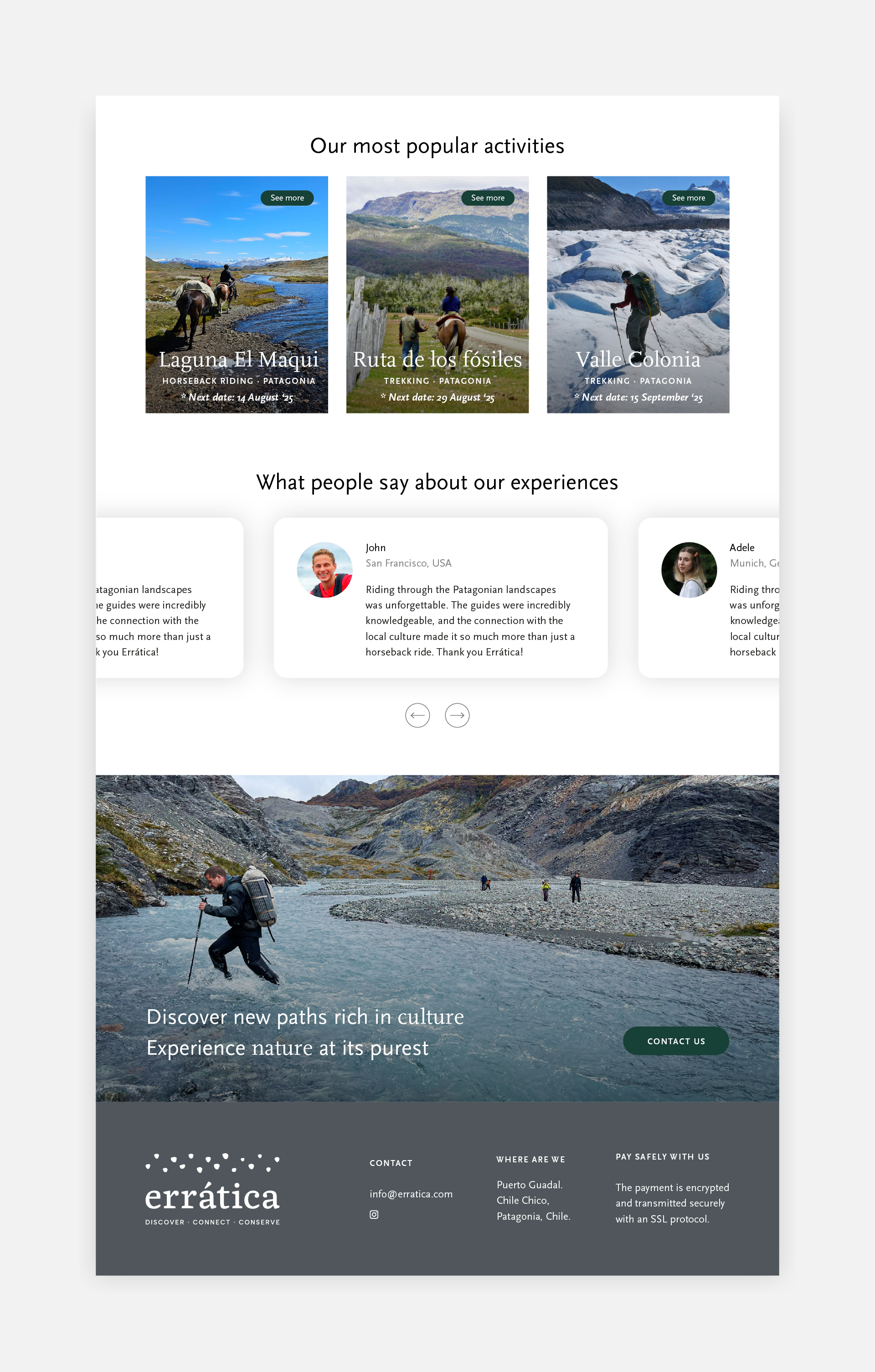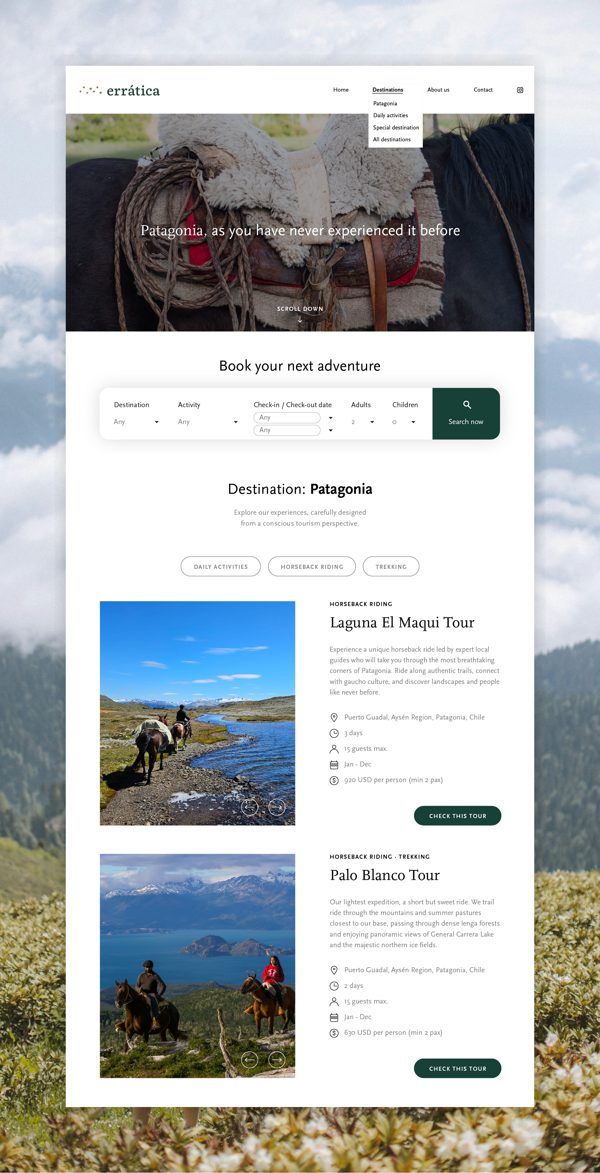El desarrollo del contenido se realizó considerando el tono de voz definido en la identidad de marca —moderno, cálido, cercano y amigable—, asegurando una comunicación clara en cada sección del sitio. Se establecieron las categorías y modos de búsqueda por actividades turísticas, y se trabajó cuidadosamente la jerarquía y disposición de la información para asegurar una experiencia fluida, intuitiva y atractiva. El resultado es un sitio web que refleja la esencia de Errática: autenticidad que invita a descubrir, conectar y vivir experiencias únicas en la naturaleza.